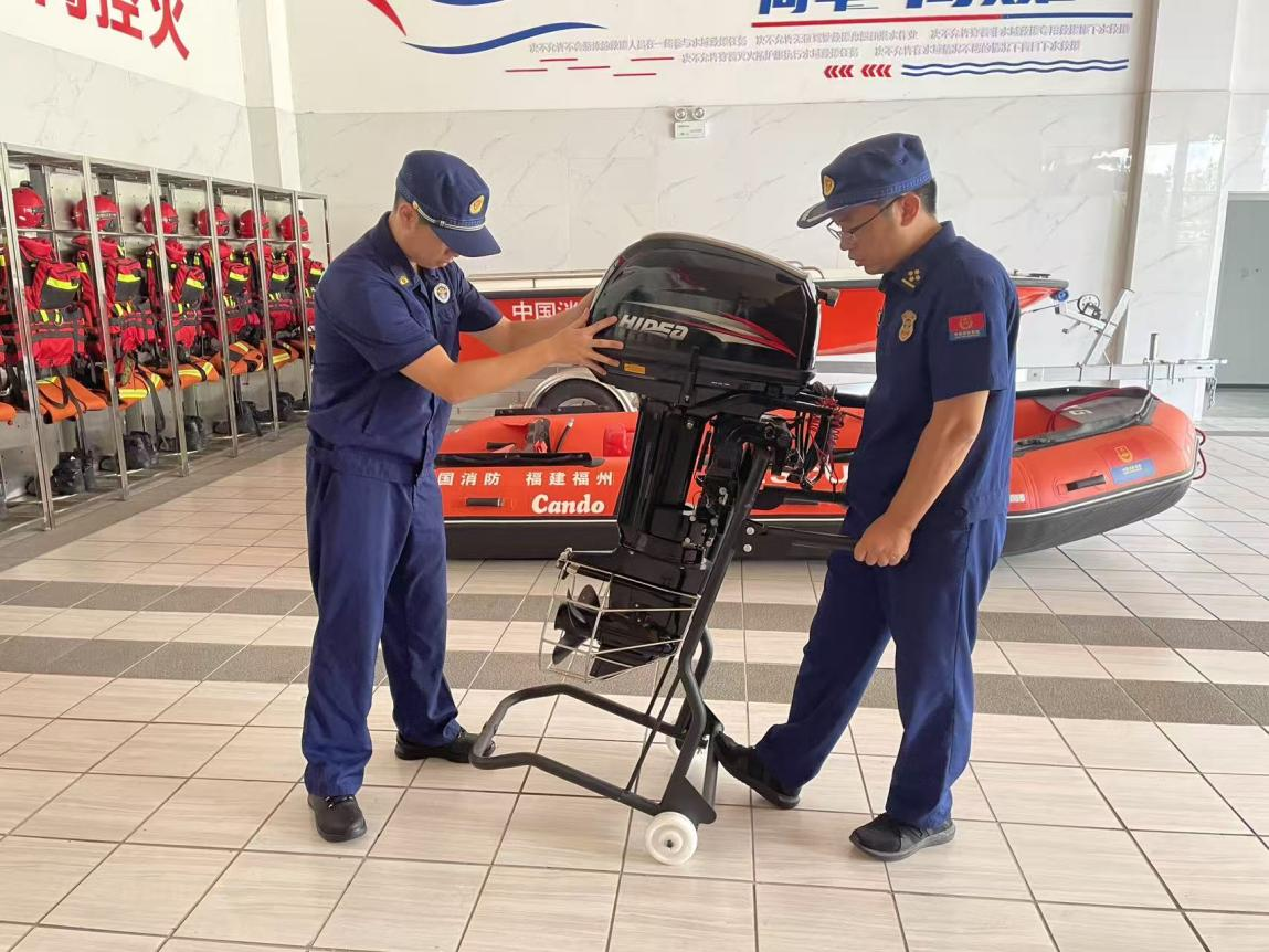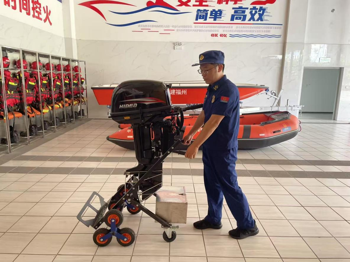 福州市仓山区消防救援大队创新研发折叠电动充气水域救援舷外机运输车