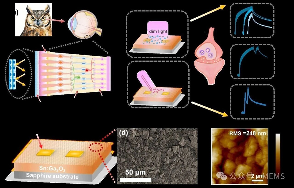 近期,南京邮电大学唐为华教授团队在国际著名学术期刊《Advanced Functional Materials》(影响因子19.0)上发表了题为“Owl-Inspired Neuromorphic Vision Sensor with Highly-Sensitive Ultraweak Deep-Ultraviolet Light Detection in Dim Environments”的研究论文。该研究受猫头鹰视网膜启发,基于锡掺杂氧化镓(Sn:Ga2O3)多晶薄膜,成功研制出一种具备硬件级伽马校正功能的神经形态视觉传感器,有效解决了微弱光环境下图像信噪比低和后期算法处理功耗高的问题。