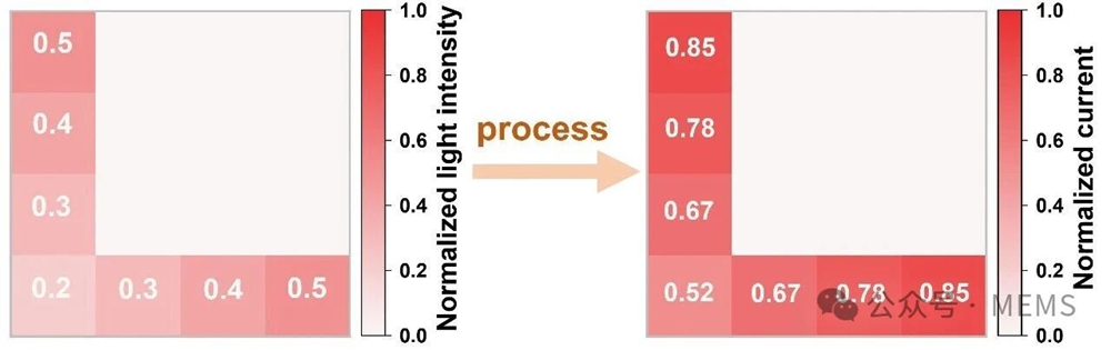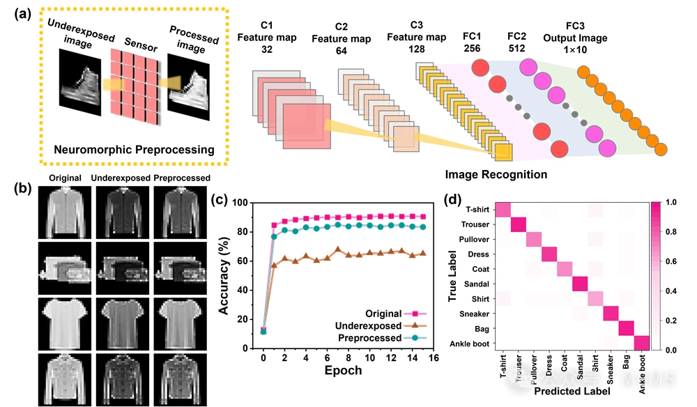 在Fashion-MNIST数据集测试中,对于严重曝光不足的图像,经由器件进行硬件预处理后,暗部细节显著恢复,识别准确率从65.20%跃升至83.44%。该成果证明了物理硬件可以高效分担算法任务,为未来低功耗仿生机器视觉系统提供了新思路。